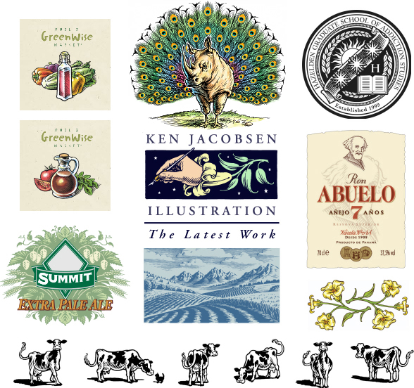 Comical whimsical cow illustrations for natural organic product promotion Vector art of outdoors for packaging background Pen and ink and water color natural product illustration Line art portrait for packaging Graphic logo illustration in vector art for academic institution Pen and ink and watercolor art for advertising Two color vector illustration of natural plants for logo Pen and ink and watercolor illustrations for organic packaging